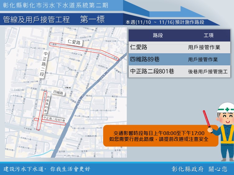 彰化市民眾請注意,為提升市區生活品質,內政部國土管理署下水道工程分署現正於彰化市區推動「污水下水道系統第二期工程」。本週(11月10日至11月16日)將持續在市中心多處路段施工,包含三民路、中正路、中山路等主要幹道,預計將對交通造成影響,提醒通勤族及用路人提前規劃路線。