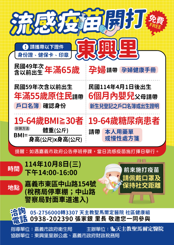 為提升疫苗接種便利性,嘉義地區的民眾注意了!天主教聖馬爾定醫院宣布,將於今年10月8日(星期三)下午2時至4時,特別在嘉義市財政稅務局的停車棚設立臨時疫苗接種站,免費提供公費流感疫苗與COVID-19疫苗,方便符合資格的民眾就近施打,增強保護力。