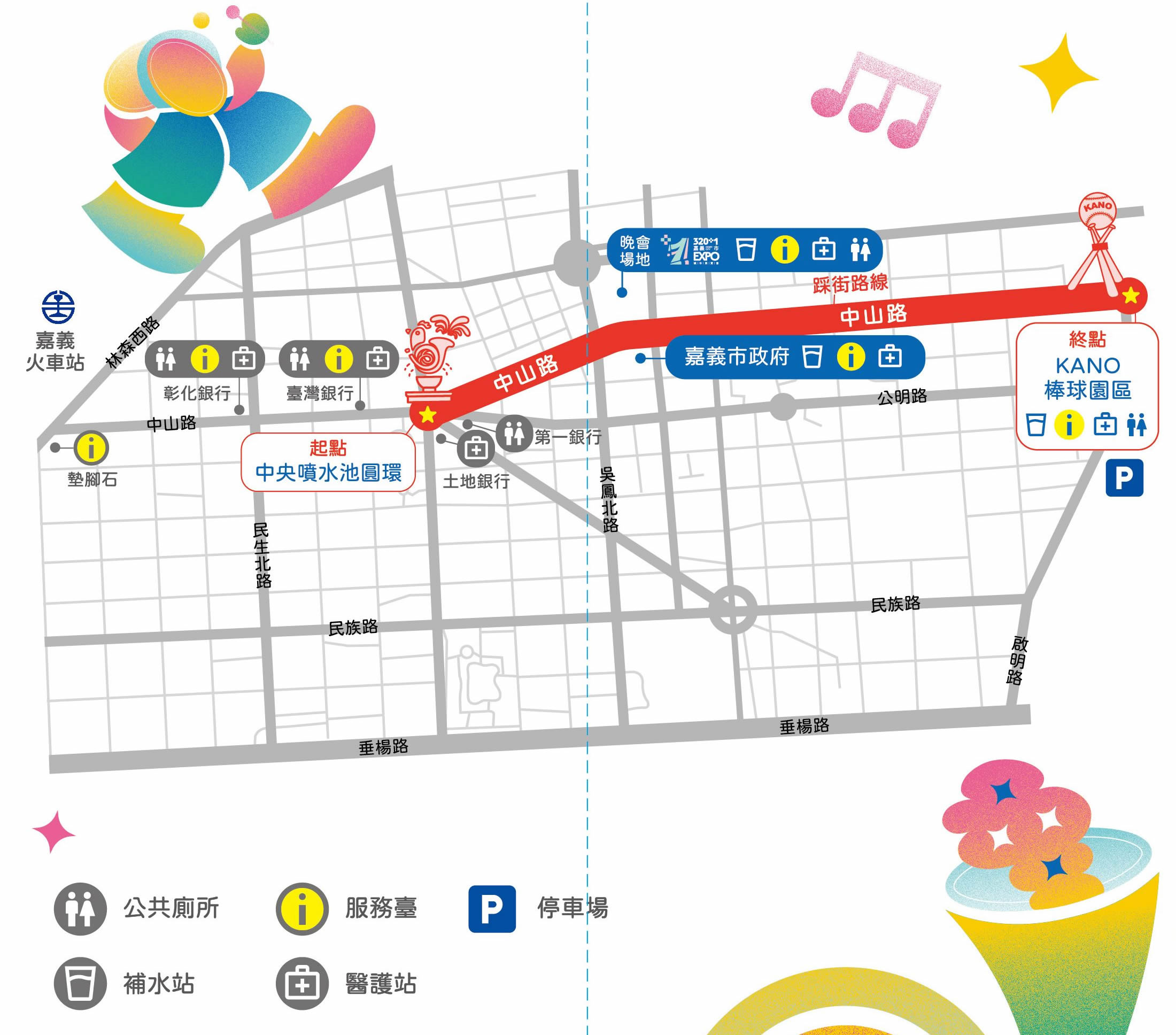 管樂節的重頭戲之一「踩街嘉年華」將於週六下午2點準時出發。今年的路線經過全新規劃,隊伍將從市中心的中央噴水池集結,沿著中山路前進,最終抵達終點站KANO棒球園區。主辦單位邀請民眾提早到場卡位,跟隨音樂的腳步,感受嘉義市充滿活力的節慶氛圍。