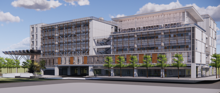 在設計上,竹東綜合行政中心以「親民的公共大客廳」為核心概念,建築正面將朝向鄰近的「客家大禾埕」廣場,並以挑高屋頂與寬敞大階梯,營造開放、迎賓的氛圍。除了導入綠建築與智慧建築設計,落實節能永續,更在二樓規劃了開放平台與都市棚架,提供民眾多元的休憩空間。到了夜晚,B棟的鎮民代表會將透過燈光設計,化身為象徵民主的「都市燈塔」,成為竹東夜晚的新亮點。