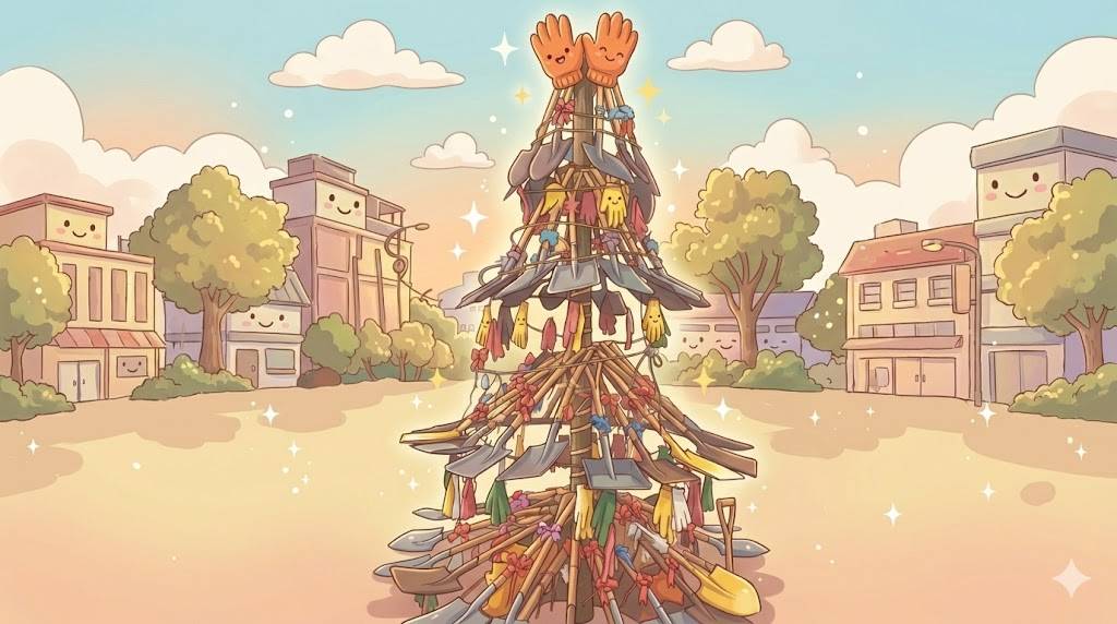 今年聖誕節,在花蓮光復鄉出現了一棵與眾不同的耶誕樹。沒有燈飾與松葉,取而代之的是堆疊起來的鏟子、推車、雨鞋與手套──這些都是「923洪災」後,志工們留下的救災工具,如今被重新賦予意義,化為向鏟子超人致敬的節日裝置。