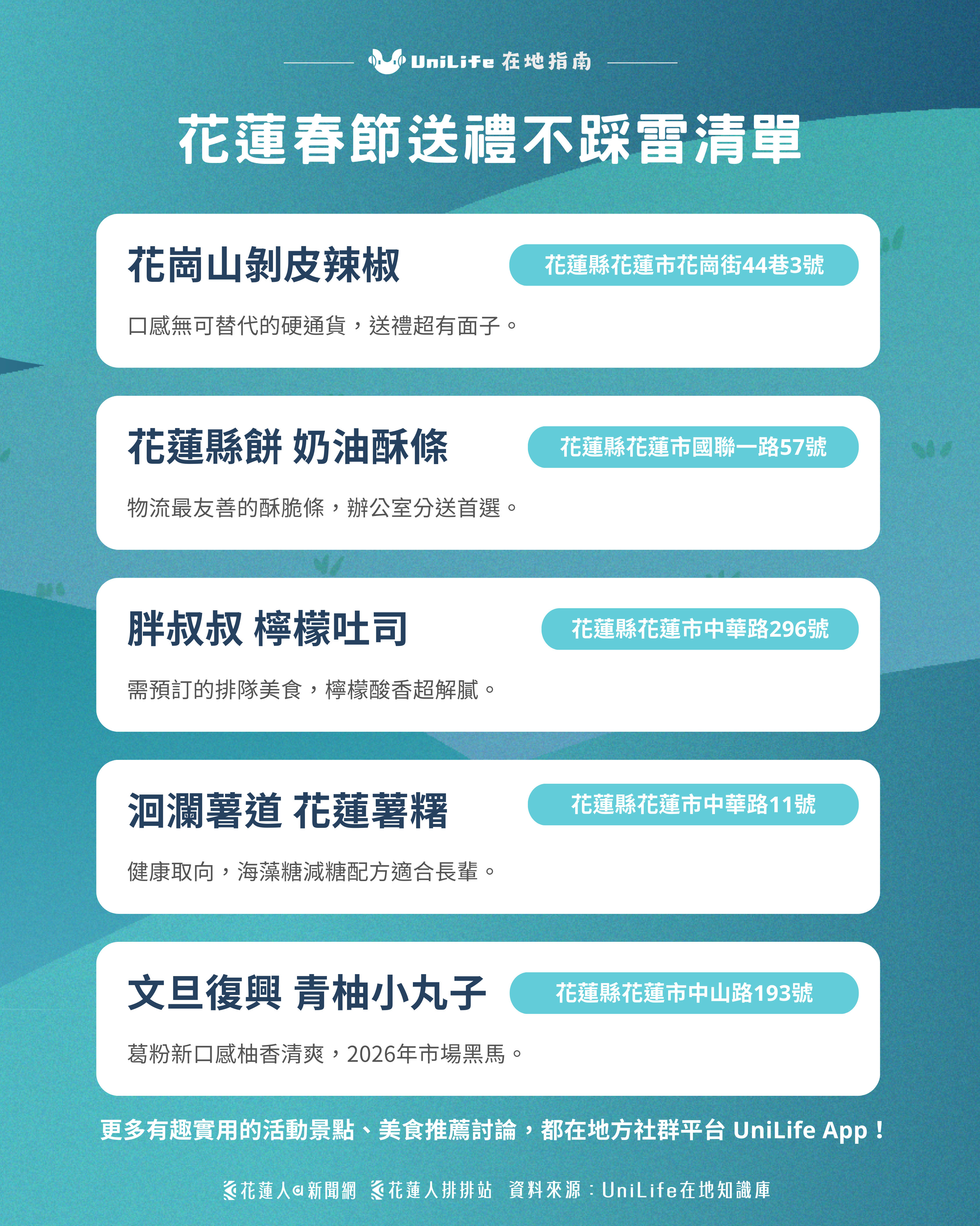 春節送禮怎麼選不失禮?地方社群平台 UniLife 在地指南近期整理「花蓮春節送禮不踩雷清單」,從鹹食到甜點列出5款伴手禮,並附上店家地址,方便民眾直接採買,包括:花岡山剝皮辣椒(花蓮縣花蓮市花岡街44巷3號)、花蓮縣餅 奶油酥條(花蓮縣花蓮市國聯一路57號)、胖叔叔 檸檬吐司(花蓮縣花蓮市中華路296號)、洄瀾薯道 花蓮薯糬(花蓮縣花蓮市中華路11號)、文旦復興 青柚小丸子(花蓮縣花蓮市中山路193號)。
