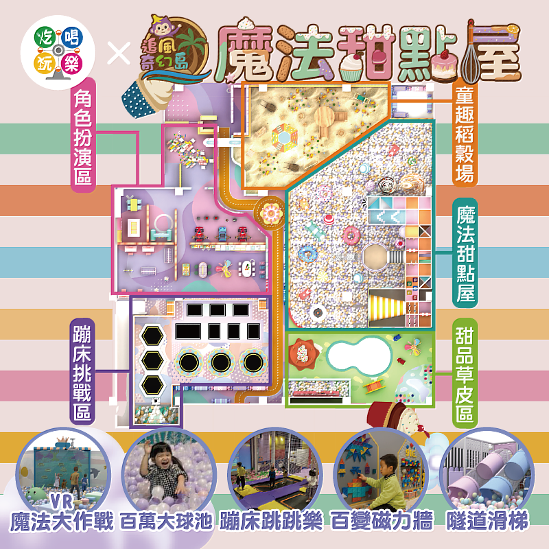 「魔法甜點屋」規劃五大主題區,結合體能挑戰、互動遊戲與角色扮演元素。其中「魔法甜點區」設有繩網迷宮、隧道滑梯、百萬大球池與VR互動遊戲;「甜甜圈蹦床挑戰區」提供多款造型蹦床與海綿池;「童趣稻穀場」主打天然稻穀沙池體驗;「角色扮演區」設有公主化妝、超市廚房、修車廠等模擬遊戲;「甜品草皮區」則規劃蜂巢滑梯、蹦蹦雲與滑行軌道車,讓孩子盡情放電。
