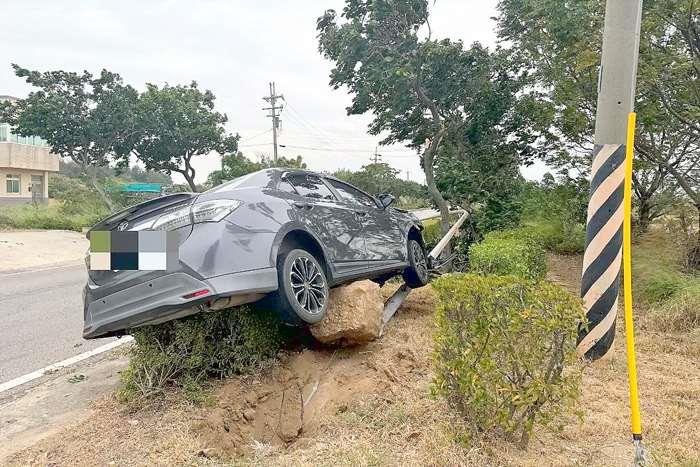 金門金寧鄉10日發生驚險自撞車禍!一名駕駛疑因身體不適,誤踩油門失控撞上路燈,導致車頭全毀、路燈倒地。駕駛胸部受傷送醫,幸無生命危險,警方已排除酒駕可能。