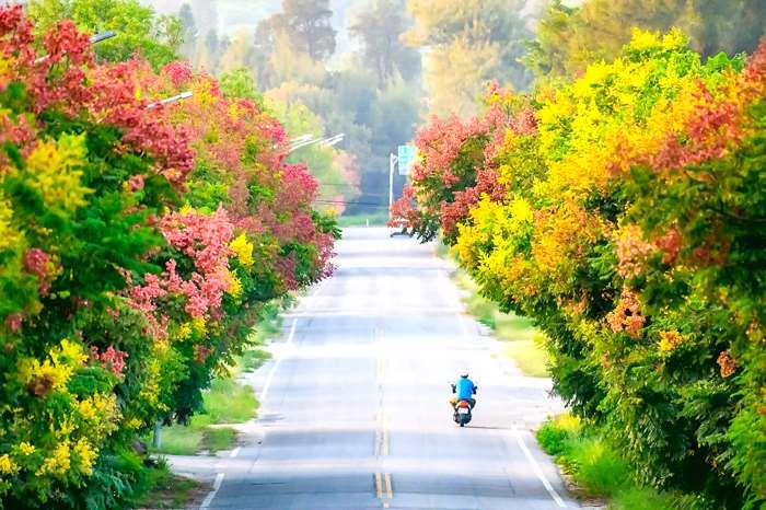 這條美麗的欒樹大道從料羅圓環一路延伸,筆直寬敞的道路在繽紛的樹景映襯下,顯得格外浪漫。對於每日往返的騎士而言,這段路程不再是單調的通勤,而是一場穿梭在自然畫布中的視覺饗宴。陽光灑落,光影在紅黃綠葉間流轉,讓每個轉彎都充滿驚喜。