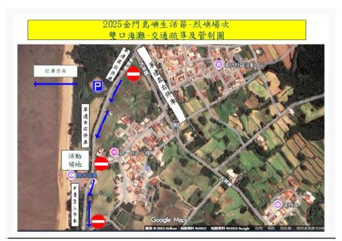 金城分局指出,為提供安全的活動空間,雙口海濱公園正前方的路段將劃設為「行人徒步區」,禁止任何汽、機車輛進入。參與活動的民眾可將車輛停放於南環道濱海大道路段的右側;若車位已滿,則可依序停往九井路段的右側空間。此外,工作人員車輛則需統一停放至南環道靠九井路段的空地停車區。警方特別強調,為維持交通順暢,烈嶼鄉南環道雙口海濱公園前的路段將「全面禁止停車」。