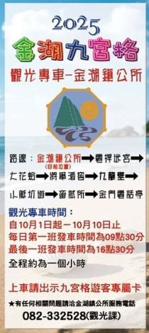 此次觀光接駁專車服務時間為活動期間每日上午9時30分至下午4時30分,將不定時發車,全程行駛時間約1小時。遊客上車時需出示「九宮格遊客專屬卡」作為搭乘憑證。專車路線經過精心規劃,從金湖鎮公所出發,依序行經電桿迷宮、大花蛤、將軍酒窖、九龍壁、小艇坑道、畜試所,最終抵達金門電話亭,一趟路程就能串起金湖7處最具代表性的歷史、人文與自然景點。