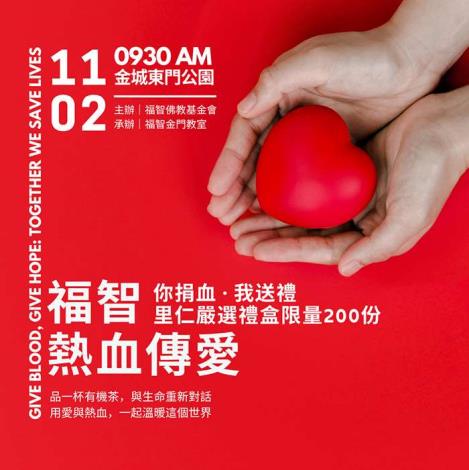為傳遞社會暖流,福智佛教基金會將於11月2日(週日)上午9時30分起,在金門縣金城鎮東門公園舉辦「2025福智熱血傳愛」活動,號召民眾一同挽袖捐血,以實際行動回饋社會。活動不僅提供捐血服務,更結合了心靈體驗與感恩奉茶,成功捐血者還可獲得限量好禮。