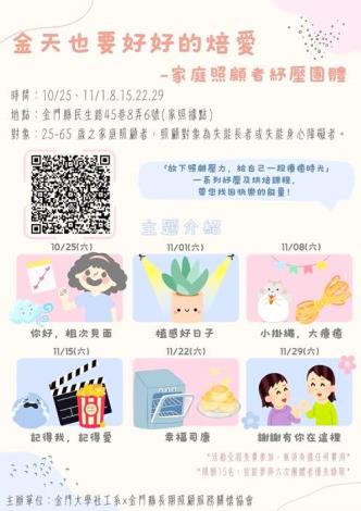 此系列紓壓團體專為25至65歲、需照顧失能長者或身心障礙者的家庭照顧者設計。活動將在金門縣家庭照顧者服務據點(金城鎮民生路45巷8弄6號)舉行,時間為下午1點30分至4點30分。六場活動主題與日期分別為:10月25日「你好,初次見面」、11月1日「植感好日子」、11月8日「小掛繩,大療癒」、11月15日「記得我,記得愛」、11月22日「幸福司康」、11月29日「謝謝有你在這裡」。活動內容豐富,包含動手製作司康、享受園藝與編織的專注時刻,以及一同欣賞電影,讓照顧者在同儕支持的氛圍中彼此傾聽、交流。