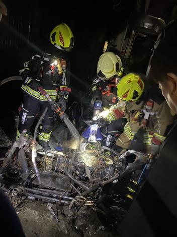 此次火災由消防局副大隊長林崇浩擔任現場指揮官。經初步勘查,火勢造成3輛電動機車完全燒毀,另2輛燃油機車也半毀,現場一片狼藉。值得注意的是,該戶民宅並未安裝住宅用火災警報器(住警器),若火勢向上延燒,後果不堪設想。消防局也藉此呼籲,民眾應重視用電安全,特別是電動機車充電時應注意周遭環境,並建議家中安裝住警器,以便在火災發生初期能即時偵測、發出警報,爭取更多應變與逃生時間,保障生命財產安全。