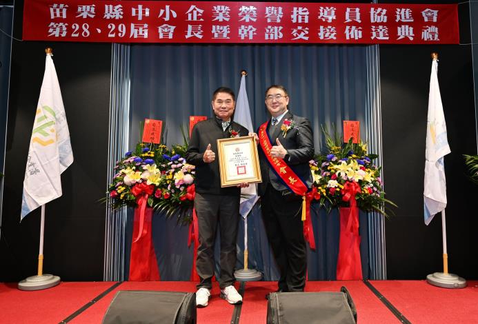 苗栗縣中小企業榮譽指導員協進會20日舉行會長交接,由翟清楠接下新任會長。縣長鍾東錦到場見證,期許協會在淨零碳排、AI數位轉型浪潮下,持續扮演政府與企業的橋樑,協助在地中小企業升級、提升競爭力。