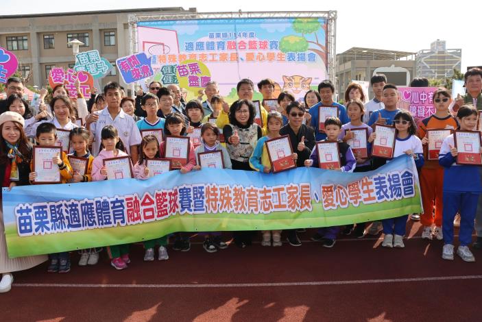 苗栗縣政府今(28)日於縣立新港國民中小學,盛大舉辦「114年度適應體育融合籃球賽暨特殊教育志工家長、愛心學生表揚會」。副縣長邱俐俐親自出席,表揚了4位默默付出的特教志工家長與31位充滿愛心的學生,並強調縣府將持續推動普特共融,讓運動平權成為苗栗的日常,為每個孩子打造能發光發熱的舞台。