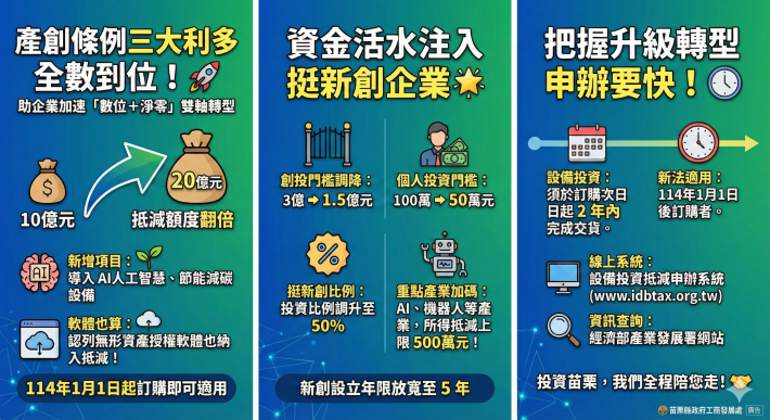 苗栗企業迎來重大利多!《產業創新條例》修正案自2025年元旦起,投資AI、節能設備的抵減額度提高至20億元,並降低個人與新創投資門檻,助攻產業全面升級。