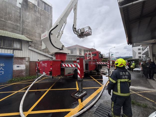 為提升救災戰力,苗栗縣消防局第一大隊今(13)日在銅鑼鄉舉行住宅火警演練,現場動員大批人車,模擬雲梯車升梯射水、破門搶救等真實情境,場面逼真,旨在強化團隊默契與人員安全,確保民眾生命財產安全。