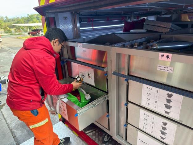 在本次的器材整備演練中,特搜隊員針對車上配置的各項精密救援裝備,進行了逐一的檢查與試運轉。這當中包含了在倒塌建築物中尋找生還者的聲納、影音生命探測器,以及用於破壞障礙物的圓盤切割器與發電機等。隊員們仔細確認所有機具的性能運作正常,並確保油料、電力隨時處於滿載狀態,務求在黃金救援時間內發揮最大效能。
