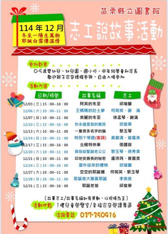 家長注意!苗栗縣立圖書館將在12月舉辦13場免費聖誕親子故事會,週週都有活動,更有一場特別的客語故事會。縣長鍾東錦邀請大小朋友一同到圖書館,在溫馨的故事聲中歡度聖誕佳節。