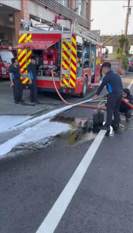 為提升油類火災搶救效能,苗栗頭屋消防隊日前舉辦泡沫滅火實戰演練。隊員們透過實際操作,熟習如何運用「泡沫瞄子」有效滅火,強化面對工廠、車輛等複雜火警的應變能力,守護鄉親安全。