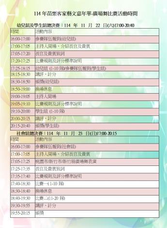 縣府文化觀光局長林彥甫說明了詳細賽程,11月22日傍晚5點將由可愛的幼兒組打頭陣,晚間7點則由充滿活力的學生組接力登場;11月23日傍晚5點開始,則是競爭最激烈的社會組總決賽。兩天共40隊將角逐各組的冠軍寶座與最高3萬元的獎金。林彥甫表示,期盼藉由這場結合客家文化與健康運動的廣場舞比賽,激發更多民眾的創意,讓客語向下扎根,並提供民眾一個欣賞多元客家藝術的絕佳機會,歡迎大家共襄盛舉。