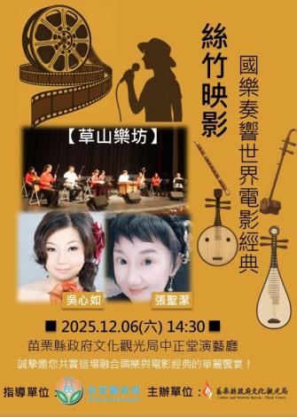 本次音樂會由草山樂坊擔綱演出,主軸為「國樂跨界電影配樂」,將大家耳熟能詳的世界電影經典主題曲,透過二胡、琵琶、笛子等絲竹樂器重新詮釋。傳統國樂細膩悠揚的音色,將賦予電影配樂中時而壯闊、時而浪漫的旋律全新生命力,帶領觀眾穿梭於不同的電影時空,重溫心中最深刻的感動。無論是國樂愛好者、資深電影迷,或是想體驗藝術多元魅力的民眾,都能在這場演出中,感受東方樂聲與西方影像語彙碰撞出的燦爛火花。