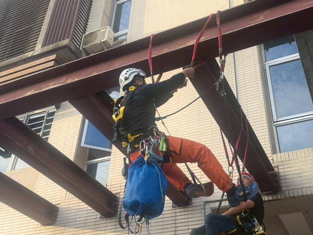 為強化高處及複雜結構的救援能力,苗栗縣消防局特搜分隊昨(21)日進行繩索技術訓練。隊員們在H型鋼結構上反覆練習輔助攀登與回收繩架設,模擬真實救災情境,展現「蜘蛛人」般的飛簷走壁技能,矢言守護縣民安全。