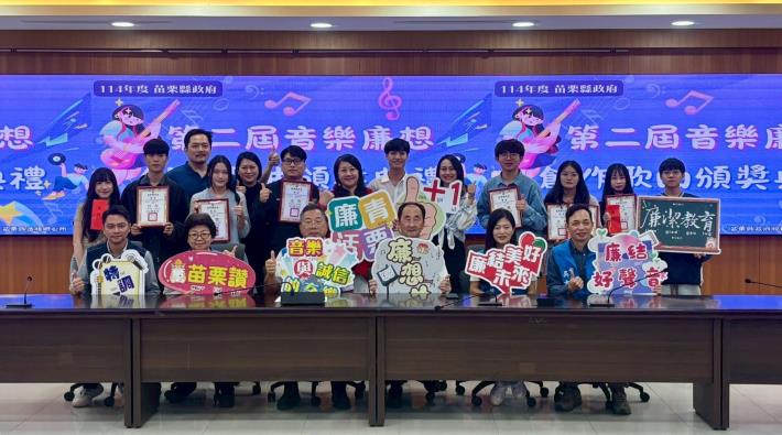 苗栗縣政府今(13)日舉行第二屆「音樂廉想」創作歌曲頒獎典禮,現場揭曉本屆賽事結果,由國立師範大學音樂系的學生團隊脫穎而出,勇奪金獎。縣府秘書長陳斌山親自出席,讚許青年學子發揮創意,將生硬的廉政口號化為動人旋律,成功為廉潔教育注入新活力。