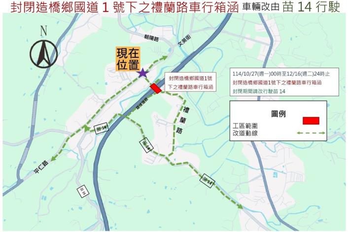 高速公路局第二新建工程分局指出,本次封閉路段為造橋鄉禮蘭路穿越國道1號的車行箱涵,是為了確保交流道工程的施工安全與進度。封閉期間,原先習慣利用此路徑通行的車輛,請務必改道行駛「苗14線」的車行箱涵。施工單位已在周邊路口設置改道指示牌,請用路人遵循標示行駛。