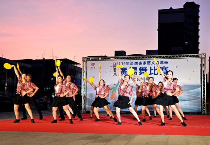 2025「苗栗客家藝文嘉年華–廣場舞比賽」社會組初賽,於11月8日晚間在苗栗縣政府前廣場熱鬧開賽。現場共有24支隊伍輪番上陣,展現精湛舞藝,爭奪晉級總決賽的10個名額。苗栗縣副縣長邱俐俐、立委邱鎮軍夫人詹美娟也到場為選手加油打氣,看到精彩處更隨著音樂節拍舞動,現場氣氛熱烈,活力四射。