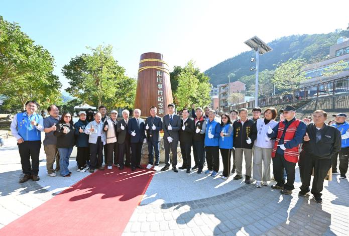 歷時三年籌備、旨在撫平歷史傷痛的「南庄事件史蹟紀念碑」,於今(11)日在苗栗縣南庄鄉的南江水岸公園正式揭幕。苗栗縣長鍾東錦與文化部、客委會及各族群代表共同見證這歷史性的一刻。鍾東錦致詞時強調,希望大家記取歷史教訓,讓南庄成為族群和諧共存的典範,實現真正的族群和解。