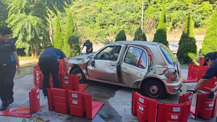 傳統用於阻擋淹水的防洪板,在這次訓練中展現了意想不到的新功能。消防人員熟練地將防洪板快速架設成一個臨時蓄水池,當面臨鋰電池持續高溫復燃的電動車火災時,能將整部車輛浸泡其中。這種「泡水降溫法」能有效抑制鋰電池的熱失控反應,是目前處理電動車火警的關鍵策略之一,大幅提升了對這類新型態火災的應變能力。
