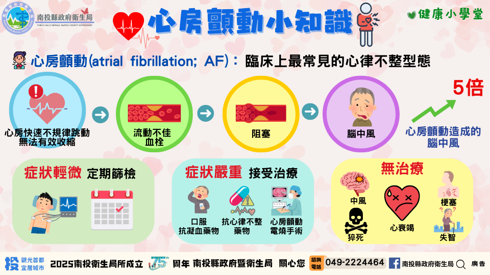 衛生局再次呼籲,健康是最大的財富,請民眾多加利用這項免費的篩檢資源,為自己的心臟健康把關。若有心房顫動篩檢相關問題,可直接洽詢各鄉鎮市衛生所,或至南投縣政府衛生局網站查詢「心房顫動(AF)手冊」等衛教資訊,共同「守護心律,預防中風」。