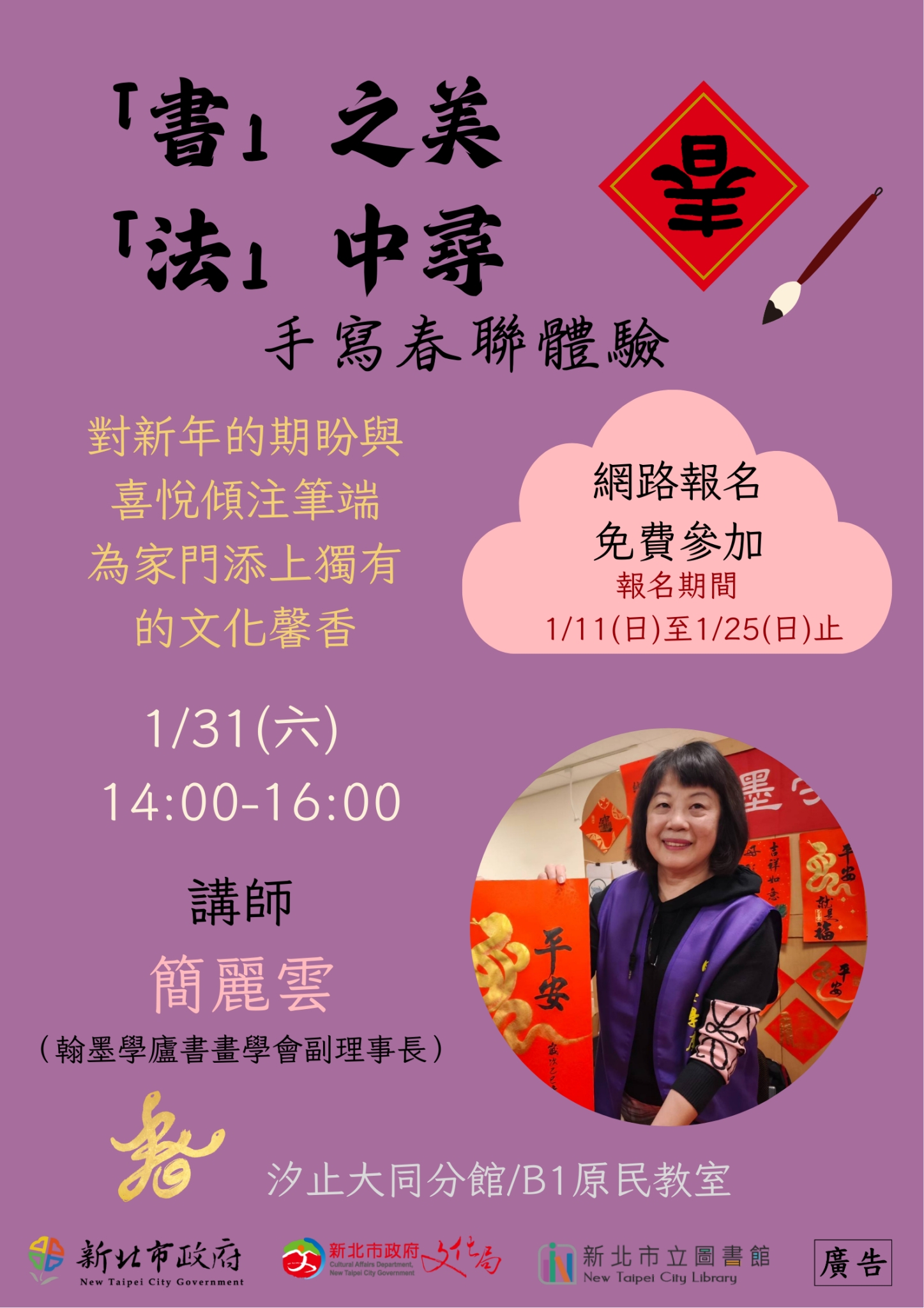 本次活動特別邀請到翰墨學廬書畫學會副理事長簡麗雲親自授課。課程中,簡麗雲老師將從書法文化簡介開始,帶領學員認識書法的氣韻與結構之美,並親自示範如何運筆揮毫。無論是初學者或是有基礎的民眾,都能在老師的指導下,從練習到實際創作,在春聯紙上寫下「春」、「福」等吉祥字或四字對聯,完成充滿個人風格與祝福的新年飾品。