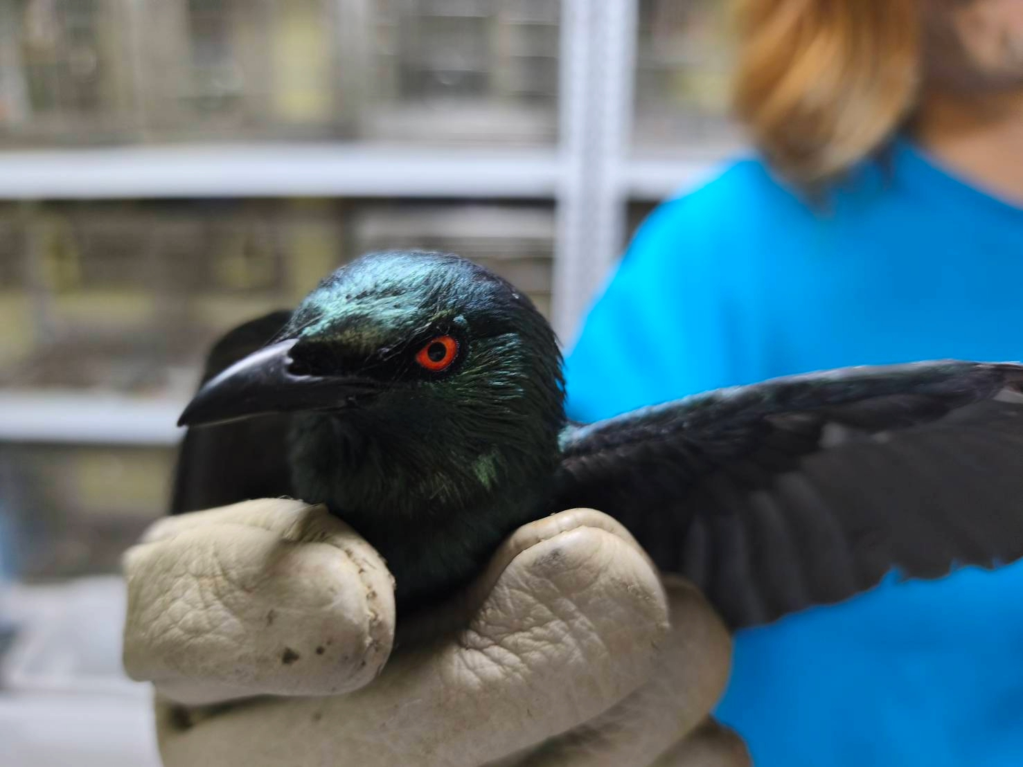 新北市新莊區一戶呂姓民眾的住家,近日上演一場「怪鳥驚魂記」。一隻全身羽毛呈現墨綠光澤、雙眼卻散發血紅色光芒的鳥,意外受困在陽台的玻璃護欄夾縫中,不斷用鳥喙撞擊玻璃發出「叩叩叩」聲響,嚇得全家人不敢靠近。在束手無策下,他們緊急通報新北市動保處請求協助,才為這位神秘訪客解圍。