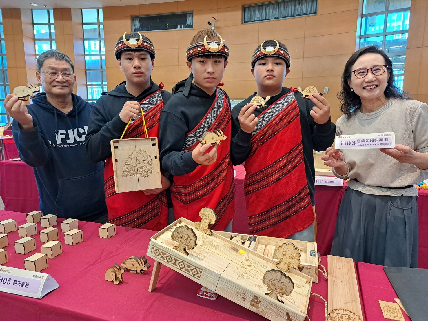 在眾多作品中,來自桃園羅浮高中國中部的作品「龜龜兔兔快樂跑」格外引人注目。三位泰雅族同學張豐碩、宗詝尋、曾健祥在林志勇老師的指導下,將廢棄棧板木材化為充滿童趣的玩具。指導過程中,輔大醫院人文處長呂慈涵一路支持,她分享孩子們在處理木材時曾感嘆:「我們是不是像這被廢棄的木材?沒人要!」這句話讓她相當不捨,並鼓勵孩子們看見自己的天賦,如同龜兔賽跑,堅持到底才是勝利。這個故事深刻體現了木育玩具如何療癒人心、建立自信。