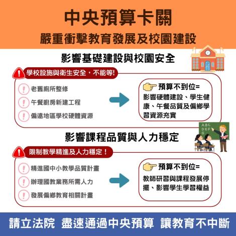 教育局長鄭新輝指出,此次經費卡關影響最鉅的,便是校園硬體設施的改善工程。其中,光是2025年(民國114年)已獲教育部核定的130校、共467間老舊廁所整修計畫,就可能因經費未到位而無法執行。此外,攸關學生午餐品質與食安的中央廚房興建工程,也同樣面臨資金問題。鄭新輝憂心,若工程無法順利推動,將直接降低校園的衛生品質與環境安全,對學生的健康造成潛在威脅。