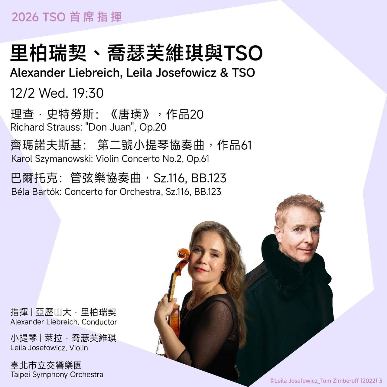 台北市古典樂迷引頸期盼的音樂盛事即將登場!臺北市立交響樂團(TSO)將於2026年12月2日晚間7點30分,於台北市中山堂中正廳舉行《里柏瑞契、喬瑟芙維琪與TSO》音樂會。本次演出由樂團首席指揮亞歷山大.里柏瑞契(Alexander Liebreich)親自執棒,並特邀國際知名的傑出小提琴家萊拉.喬瑟芙維琪(Leila Josefowicz)擔綱獨奏,將為觀眾帶來一場橫跨浪漫主義與現代主義的聽覺饗宴。