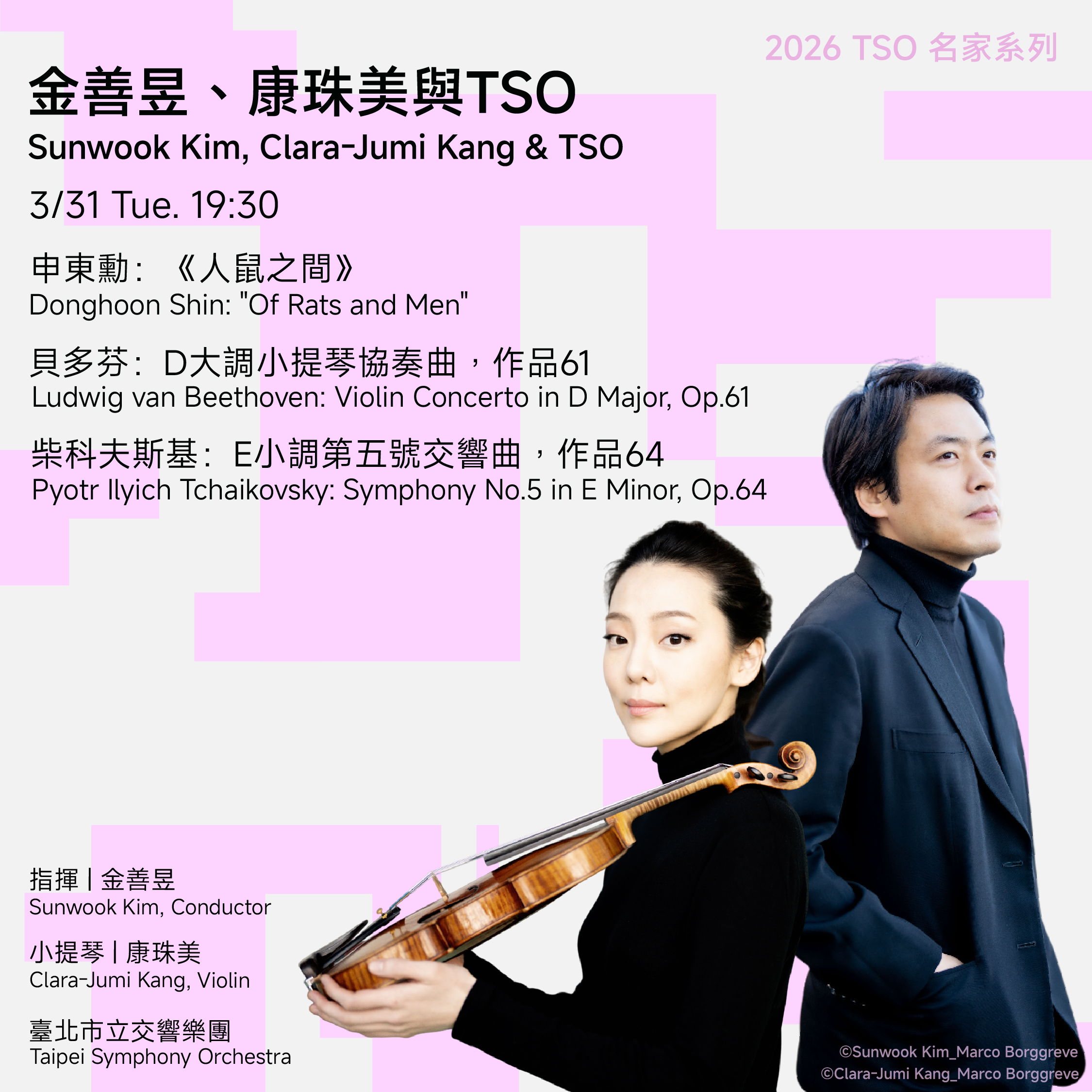 古典樂壇的韓流即將席捲臺北!臺北市立交響樂團(TSO)隆重宣布,「2026 TSO名家系列」音樂會將於明年(2026年)3月31日晚間七點半,於臺北國家音樂廳盛大舉行。本次演出邀集兩位享譽國際的南韓音樂家,由近年成功從鋼琴家轉型為指揮家的金善昱執棒,並攜手德韓裔小提琴天后康珠美,共同為樂迷獻上一場橫跨古典與現代的音樂饗宴。