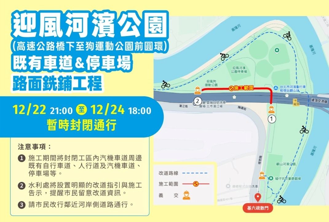 用路人注意!北市松山區迎風河濱公園自12月22日晚間9時起,將進行路面施工並封閉部分道路至24日傍晚6時,範圍含汽機車道與自行車道,提醒民眾提前改道。