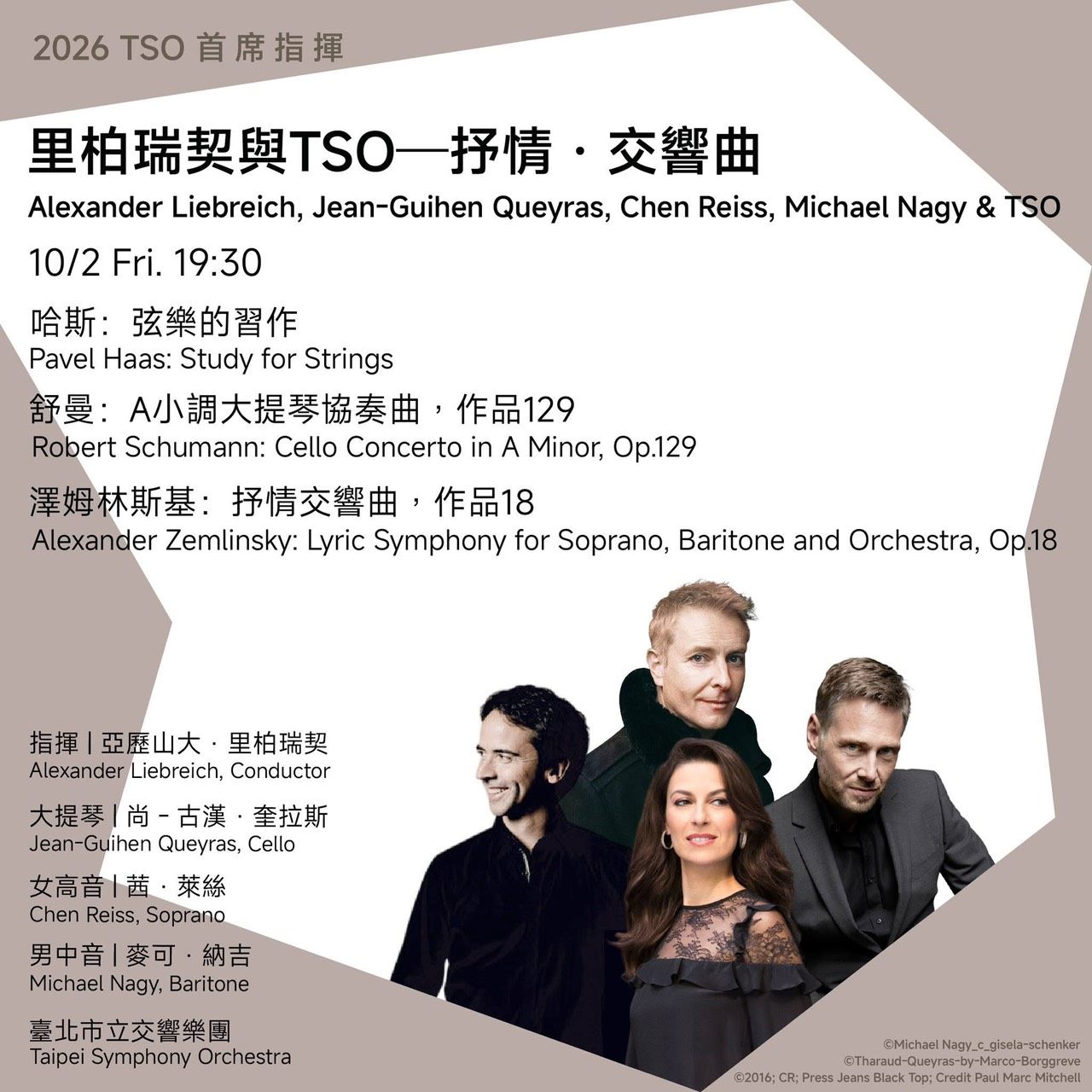 本次音樂會星光熠熠,除了由首席指揮里柏瑞契擔綱靈魂人物,更邀請到三位國際級音樂家同台獻藝。享譽國際的大提琴家尚-古漢・奎拉斯(Jean-Guihen Queyras)將帶來精湛的獨奏;而女高音茜・萊絲(Chen Reiss)與男中音麥可・納吉(Michael Nagy)也將以其動人歌喉,為壓軸曲目增添無盡色彩。四位大師與TSO的合作,勢必將激盪出燦爛的音樂火花。