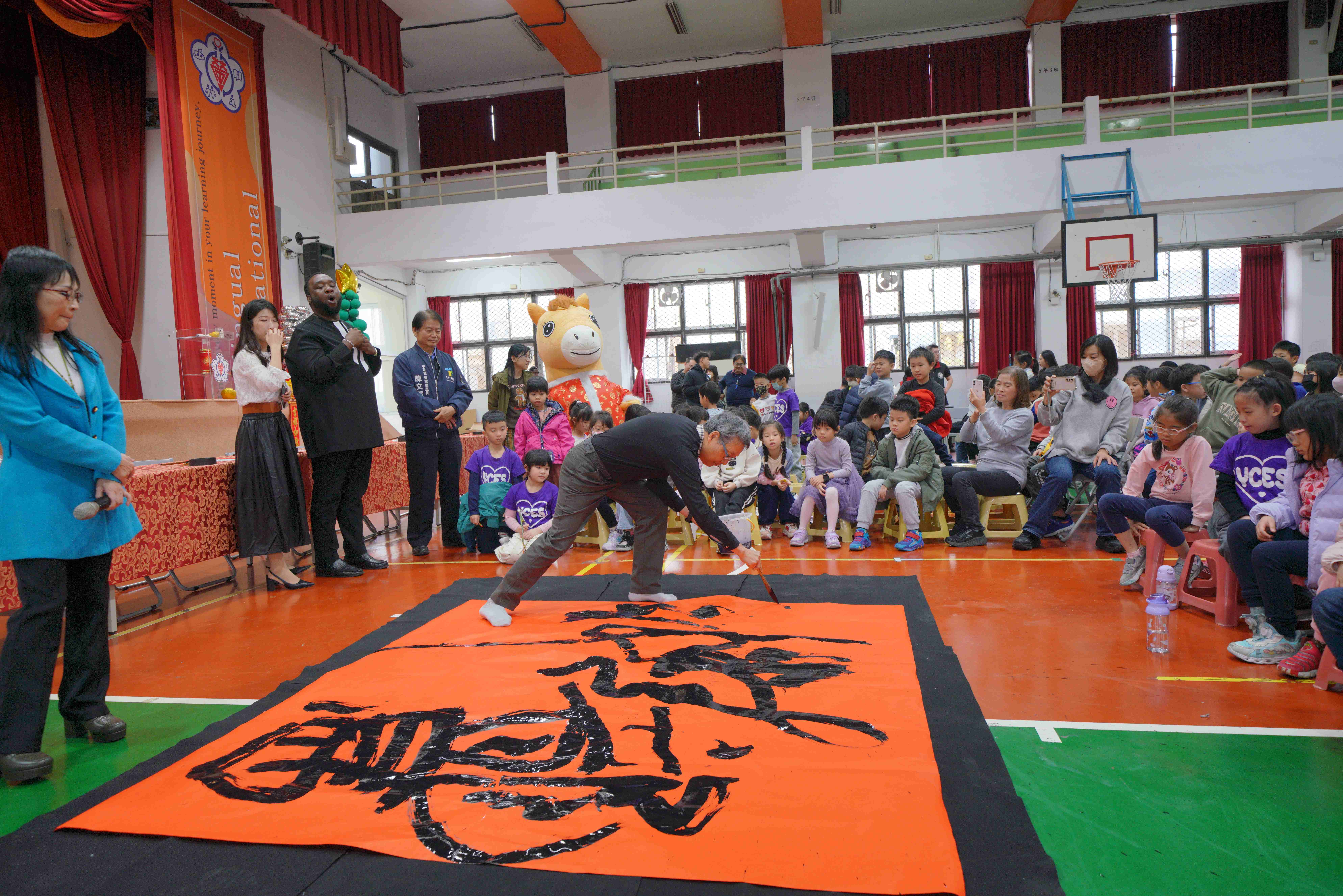 為了迎接即將到來的農曆馬年,臺北市中正區螢橋國小於今(21)日盛大舉辦「揮毫賀新春.多語展智慧」歲末活動,將傳統書法藝術與多元文化、科技教育巧妙結合,場面熱鬧非凡。