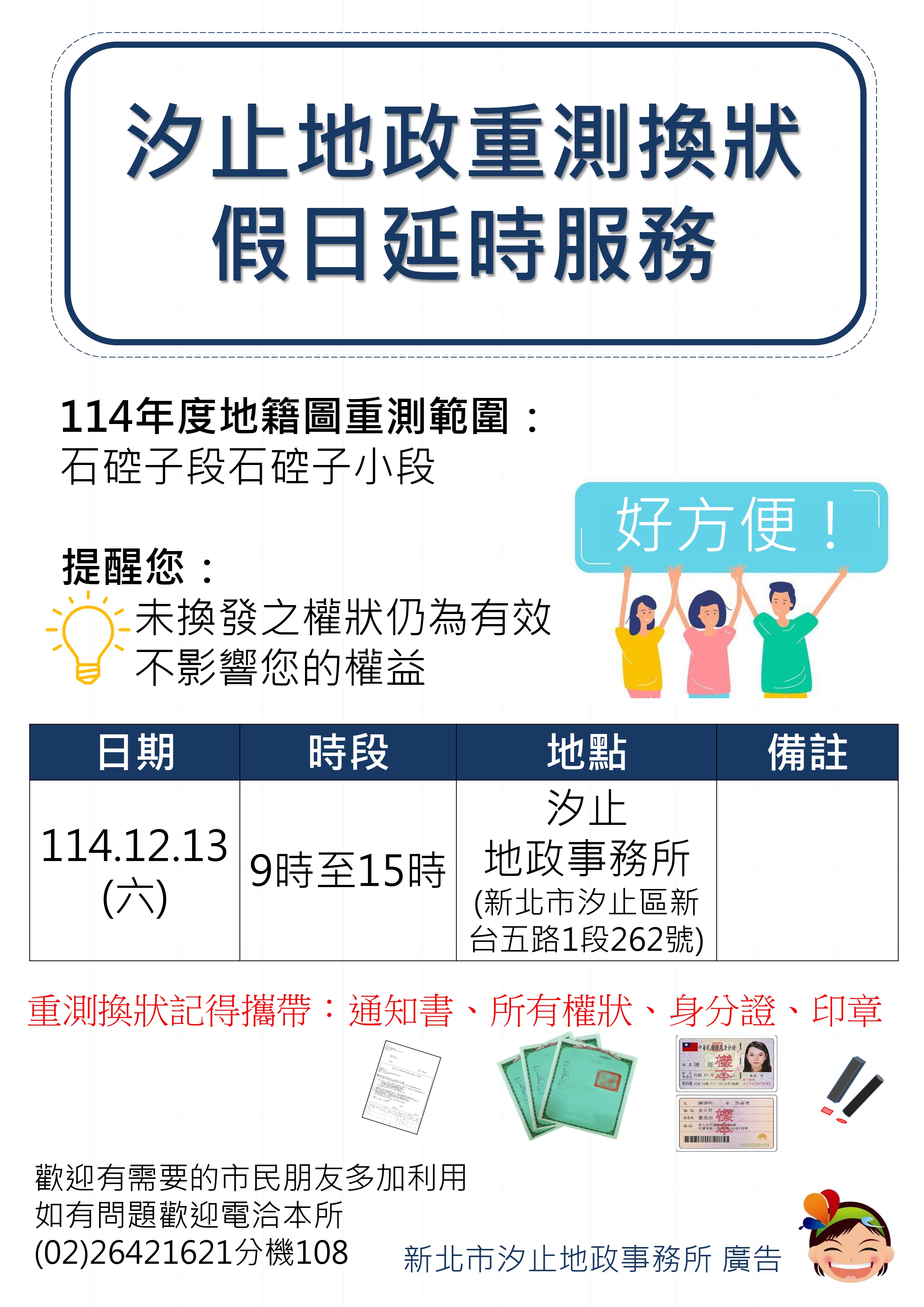 新北市汐止地政事務所主任歐彥熙表示,考量到重測區域較為偏遠,且許多民眾是上班族,平日請假不易,因此將在2025年12月13日(星期六)上午9時至下午3時,於事務所一樓大廳加開假日延時服務,協助民眾辦理換狀。歐彥熙提醒,前往辦理時請務必攜帶換狀通知書、身分證正影本、印章及舊的所有權狀。若委託他人代辦,則需額外攜帶受託人的身分證正本與印章。
