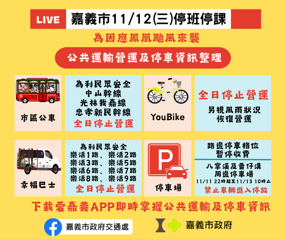 因應鳳凰颱風來襲,嘉義市政府宣布11月12日(三)停止上班上課。為確保市民安全,市區公車、幸福巴士及YouBike公共自行車也將全面暫停營運,提醒民眾做好防颱準備並留意最新交通資訊。