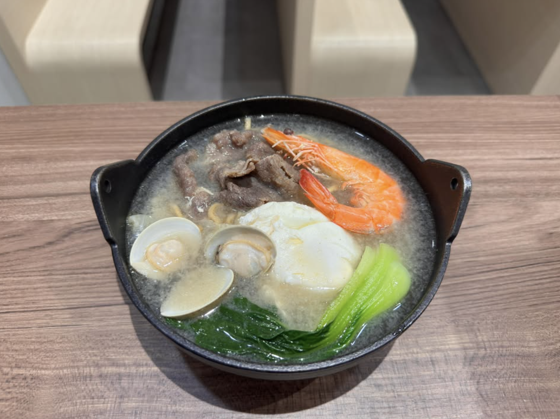 這裡的鍋燒麵是對「真材實料」的最好詮釋,拒絕使用廉價的加工火鍋料填充,而是將重點回歸食材本身。麻油湯頭香氣醇厚卻不顯油膩,溫潤地包裹著每一根麵條;酸辣湯頭則開胃提神,風味鮮明有致。碗中滿載新鮮的豬肉片與飽滿蛤蠣,份量十足,帶來扎實的飽足感。每一口湯頭與配料,都反映出店家從基底開始熬煮的堅持與用心,讓吃麵不再只是果腹,而是一種暖心的享受。