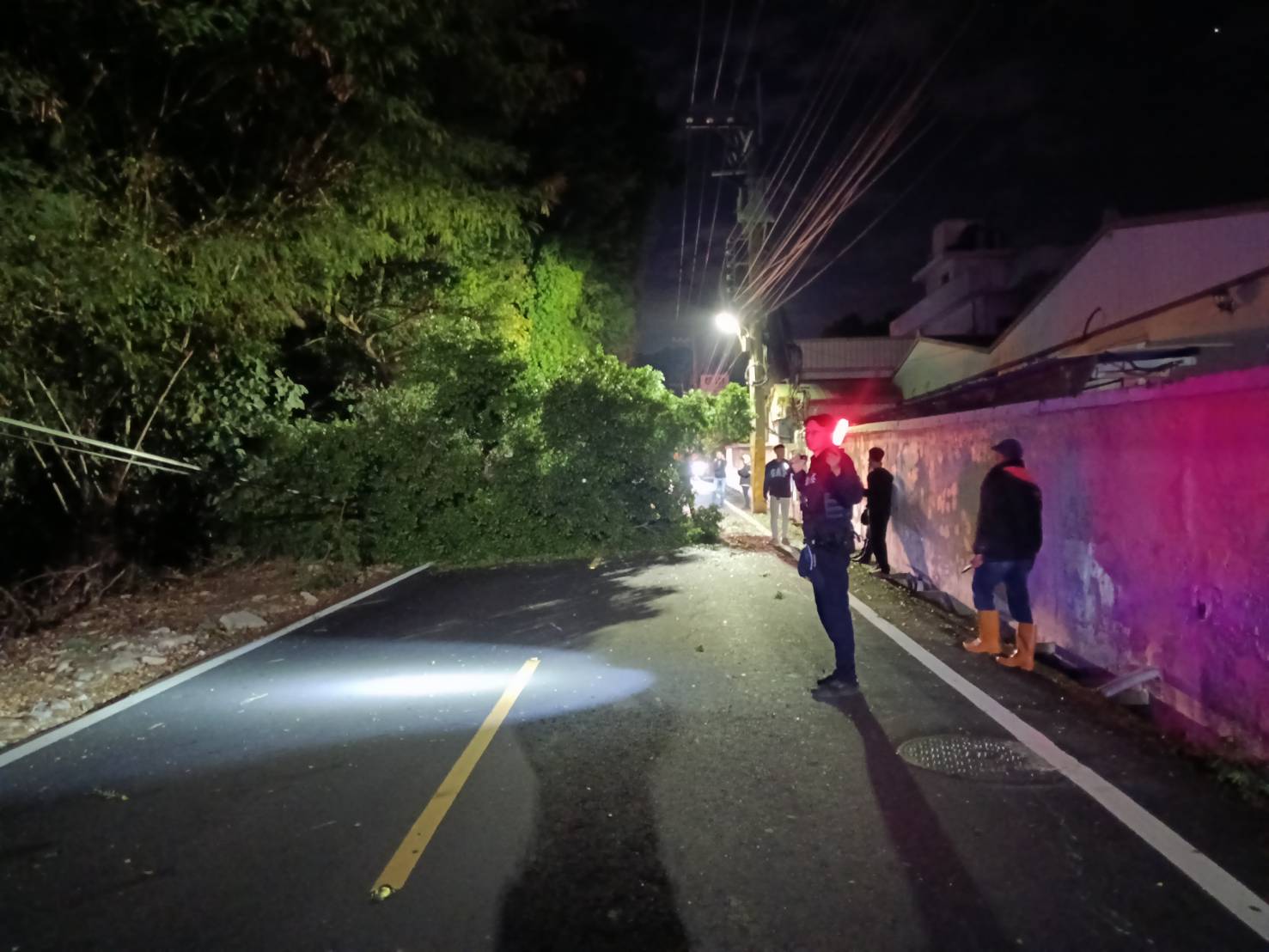 警方抵達現場時,發現一棵路旁的大樹因遭蛀蝕而結構脆弱,應聲倒塌並佔據了整個車道,情況相當危險。為了盡快紓解車流,巡佐賴志騰與警員蕭兆勛在設置三角錐、拉起封鎖線示警後,隨即徒手將部分樹幹與枝葉移至路旁,迅速清出一條可供單向通行的車道。兩人一人負責進行交通疏導,另一人持續清理,展現了高效的應變能力。