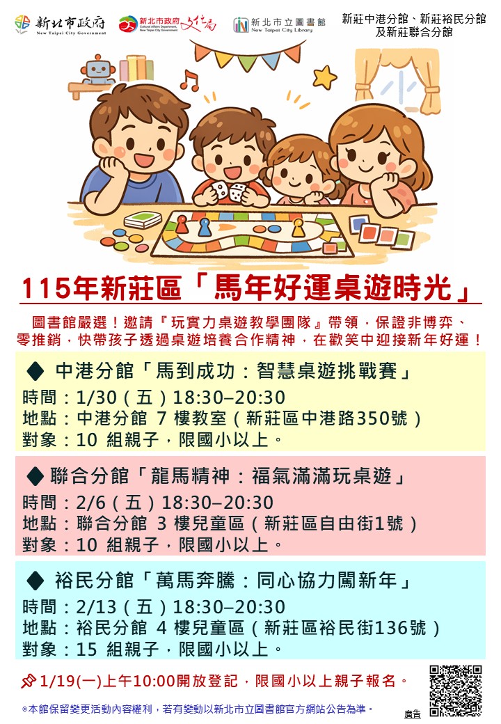 準備好迎接2026馬年春節了嗎?新北市立圖書館特別在新莊區舉辦「開卷有馬福氣到」系列活動,邀請親子家庭透過有趣的桌遊,一同在歡笑中培養合作精神、迎接新年好運。活動完全免費,將於1月19日上午10點開放線上報名,是寒假期間不容錯過的優質親子活動。