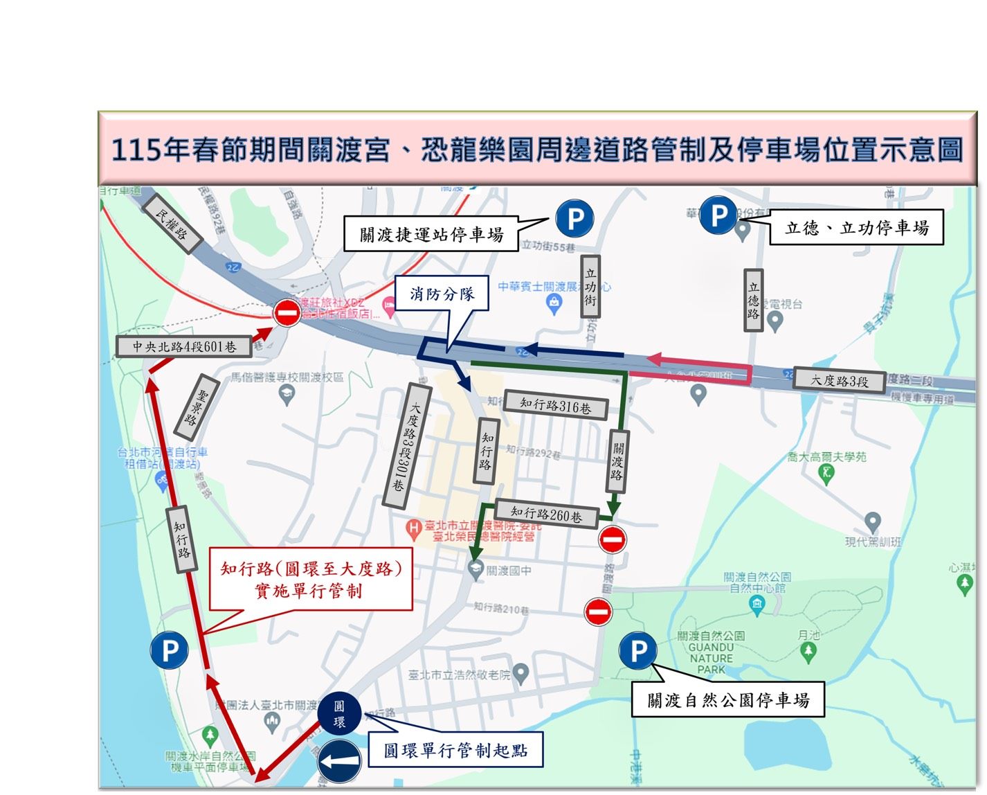 北投警分局指出,本次春節交通管制時間自2月16日除夕夜22時起,至2月22日初六18時止,每日管制時段略有不同。管制核心區域包括:知行路(關渡宮牌樓至大南汽車修理廠)將採單向通行,車輛只出不進;欲前往關渡宮的車輛需由關渡路及知行路進出。當關渡宮停車場滿位時,知行路圓環將啟動車輛總量管制,引導車輛至立德路、立功街口的替代停車場。此外,為保障行人安全,知行路部分路段將實施「人車分道」。