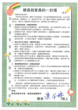 在數位時代,「網路安全」也是假期的關注重點。鍾東錦建議家長可與孩子共同約定合理的上網時間與規範,培養良好的網路素養,並教導孩子保護個人隱私,不要在網路上輕易透露個資。同時,他也提醒孩子應珍惜生命、拒絕毒品,並遠離來路不明的食品、菸品及電子菸,以確保身心健康。信末,鍾縣長再次強調家庭陪伴是孩子成長最堅實的力量,期盼家校合作,共築安全防護網。