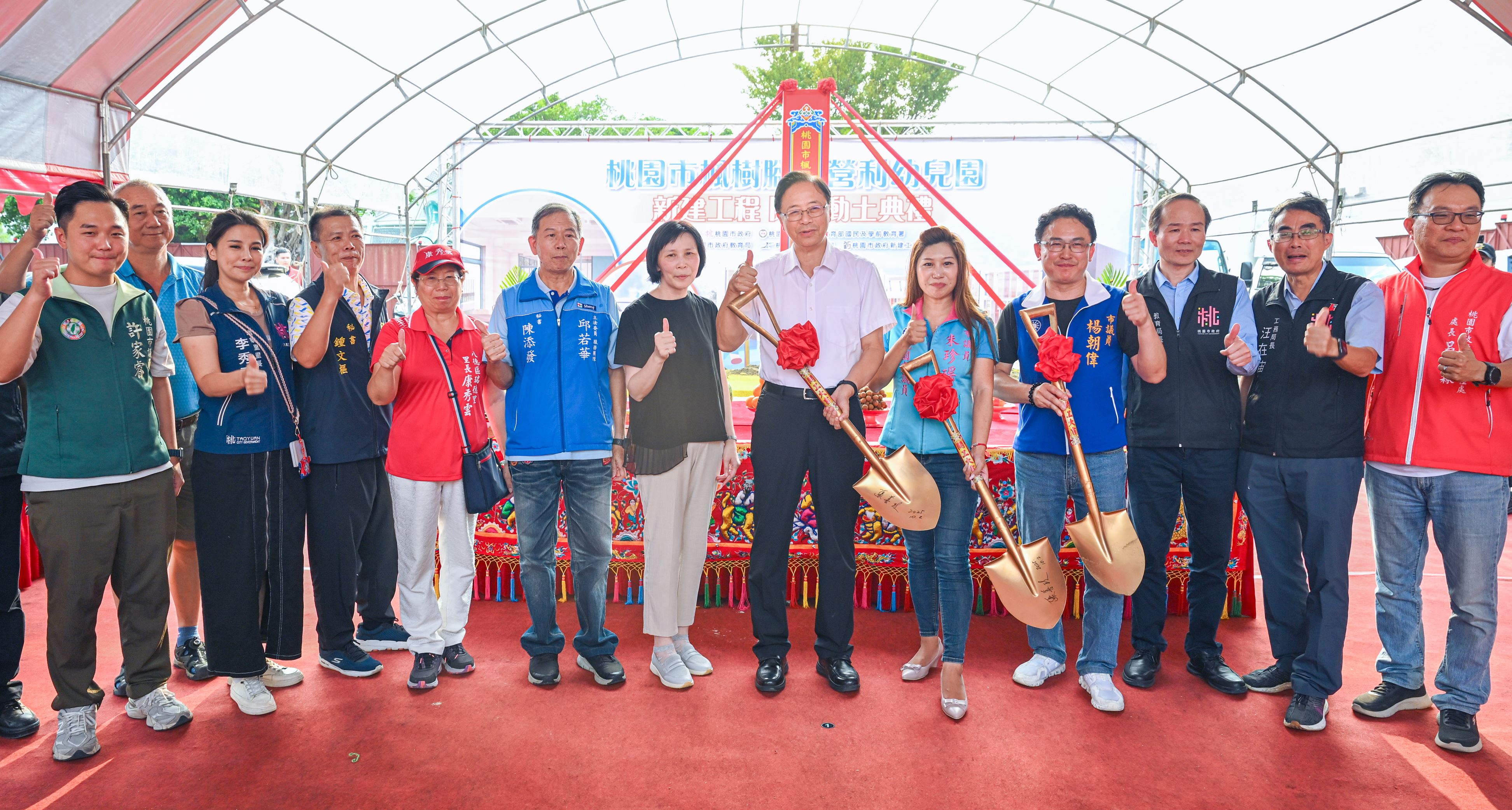 今日動土典禮,市議員楊朝偉、朱珍瑤、許家睿,以及市府工務局長汪在宙、教育局長劉仲成、八德區長蔡豊展等多位貴賓也共同出席,見證八德區育兒環境邁向新的里程碑。